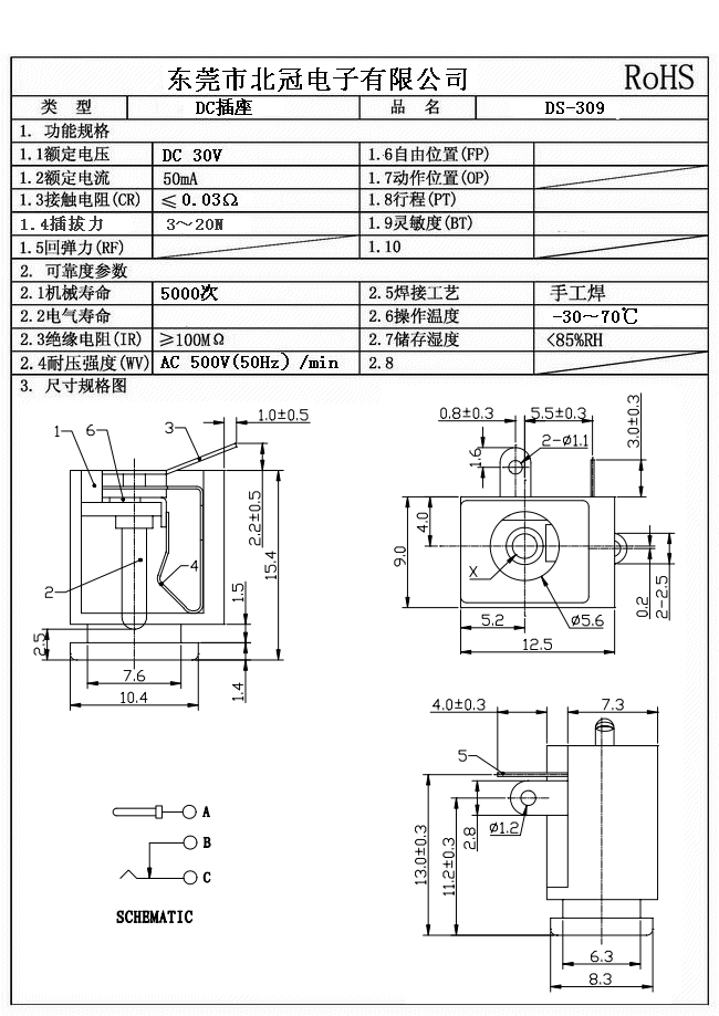 Typical Specifications 1. Rating : DC 30V 0.5A 2. Contact Resistance : 70?Max 3.Lnsulation Resistance: DC500V 1Minute 4.Operating Temperature Range: -25℃+80℃ 5.Ambient Humidity Used: ≤85%RH 6. Operating Force : 3-20N 7. Operating Life : 5,000Cycles