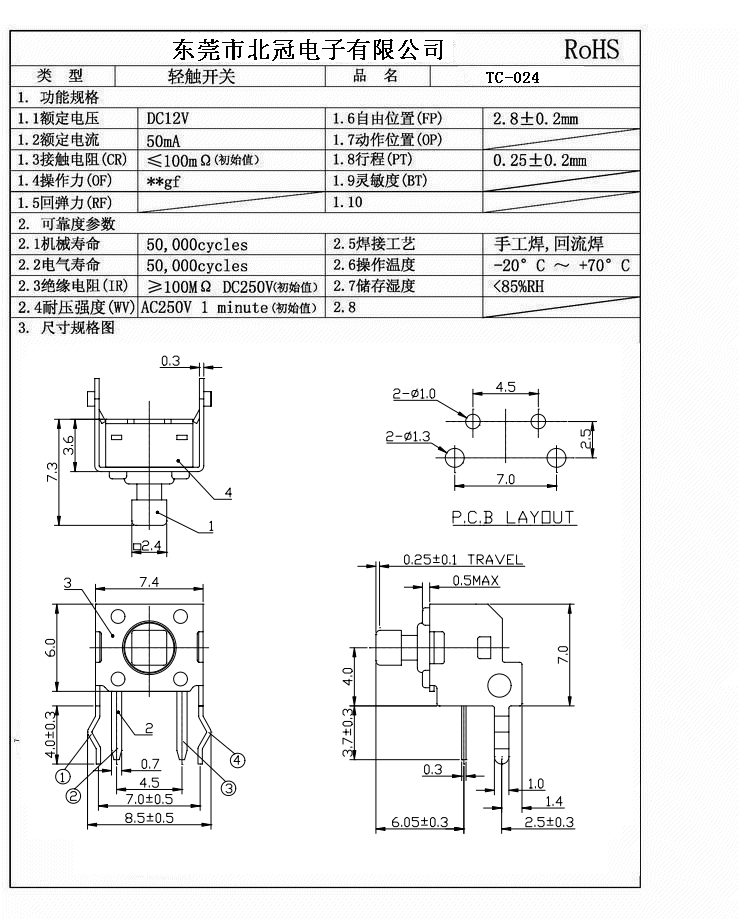 3.Lnsulation Resistance: ≥100mΩ DC250V