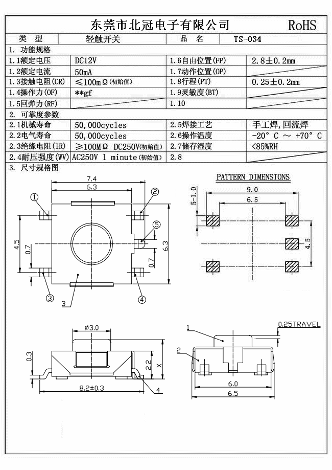 產(chǎn)品名稱:TS-034輕觸開關(guān) Typical Specifications |