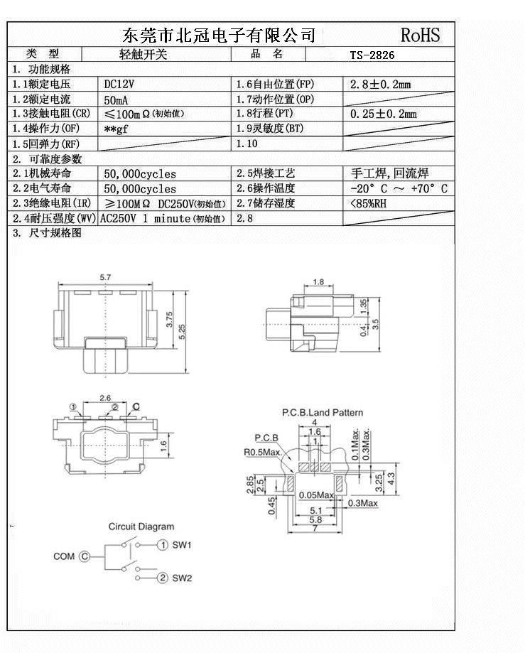 產(chǎn)品名稱:TS-2826輕觸開關(guān)