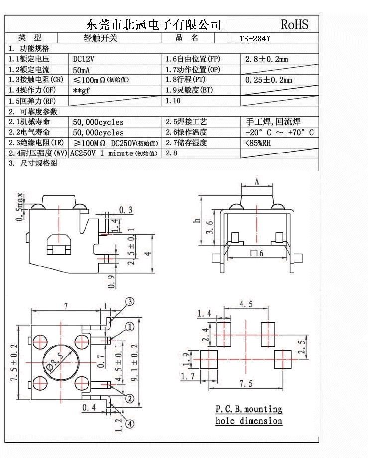 3.Lnsulation Resistance: ≥100mΩ DC250V