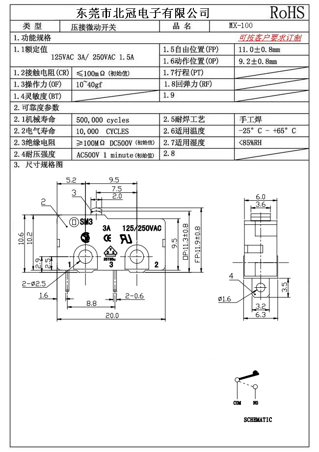 3.Lnsulation Resistance: ≥100mΩ DC500V