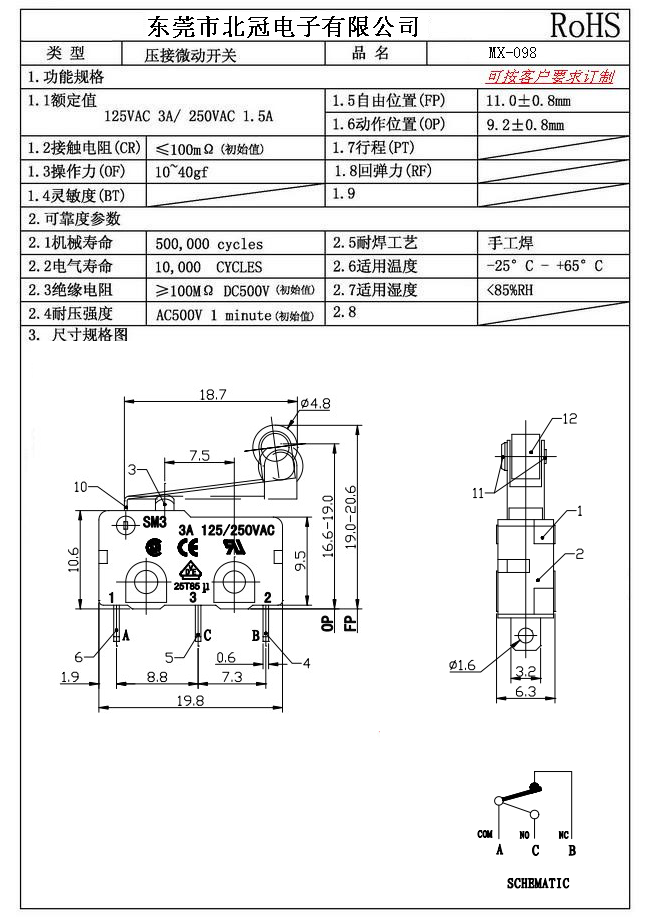Typical Specifications 1.Rating : DC30V 0.1A 2.Contact Resistance: ≤100mΩ 3.Lnsulation Resistance: ≥100mΩ DC500V 4.Operating Temperature Range: -25℃+85℃ 5.Ambient Humidity Used: ≤85%RH 6.Mechanical Life: 100,000Cycles 7.Operating Force:30±10gf 8.OP:8.8±0.8mm 9.Order: AC 125V 3A