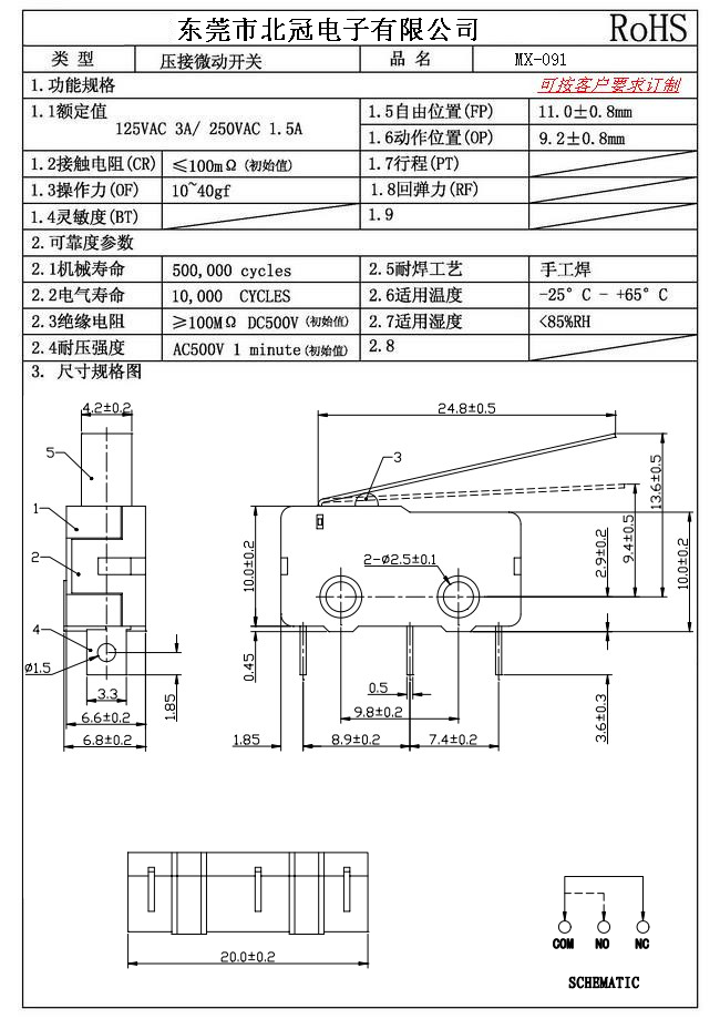 Typical Specifications 1.Rating : DC30V 0.1A 2.Contact Resistance: ≤100mΩ 3.Lnsulation Resistance: ≥100mΩ DC500V 4.Operating Temperature Range: -25℃+85℃ 5.Ambient Humidity Used: ≤85%RH 6.Mechanical Life: 100,000Cycles 7.Operating Force:30±10gf 8.OP:8.8±0.8mm 9.Order: AC 125V 3A