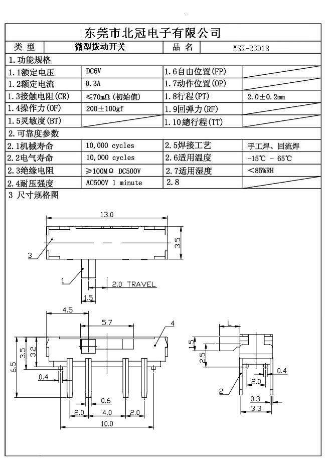 Typical Specifications 1. Rating : DC 12V 50mA 2. Contact Resistance :≤50mΩ 3.Lnsulation Resistance: DC500V 1Minute 4.Operating Temperature Range: -25℃+80℃ 5.Ambient Humidity Used: ≤85%RH 6. Operating Force : 200gf 7. Operating Life : 10,000Cycles