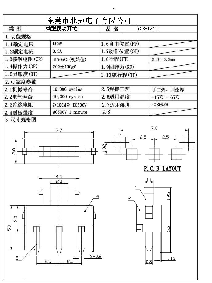 Typical Specifications 1. Rating : DC 12V 50mA 2. Contact Resistance :≤50mΩ 3.Lnsulation Resistance: DC500V 1Minute 4.Operating Temperature Range: -25℃+80℃ 5.Ambient Humidity Used: ≤85%RH 6. Operating Force : 200gf 7. Operating Life : 10,000Cycles