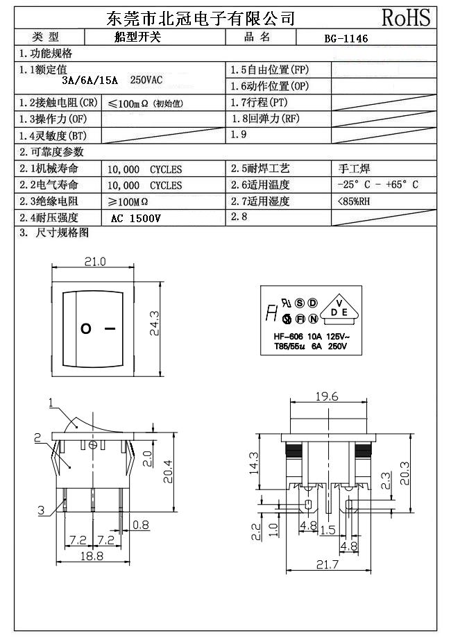 技術(shù)參數(shù)〔SPECIFICATION〕 額定電流、電壓: 6(4)A 250VAC 6A/125A 250VAC 6A 250VAC/10A 125VAC 接觸電阻:≤20mΩ 絕緣電阻:≥100MΩ 介電強(qiáng)度:≥1800VAC/3S 電器壽命:≥10000次