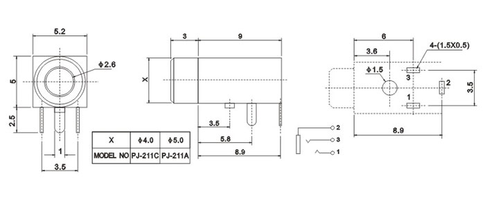 產(chǎn)品名稱:PJ-211C 品名:2.5耳機插座 |